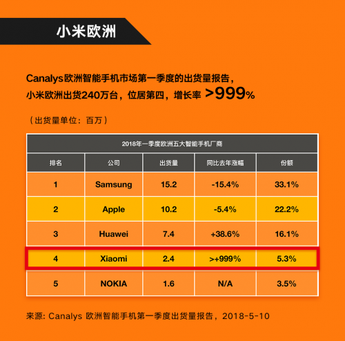 而在欧洲市场,小米手机2018年一季度出货量高达240万部,增长率超过999%,市场份额也猛增至5.3%,目前位居第四。