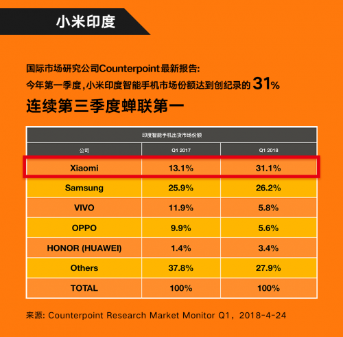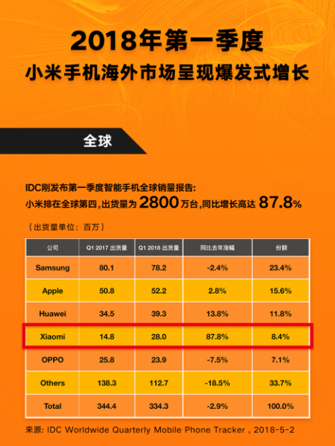数据显示,经历了2017年的快速增长,2018年一季度小米手机在海外继续保持了强势的增长态势。其中,小米手机Q1出货量达到2800万台,较去年同比增长87.8%,市场份额为8.4%,超越OPPO排名全球第四位。