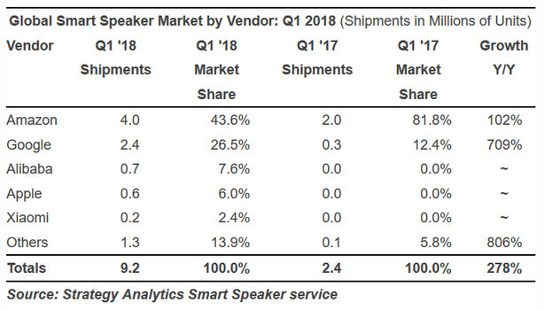 根据市场调研公司Strategy Analytics的统计,2018年第一季度度全球智能音箱出货量累计为920万,其中亚马逊Echo系列出货为400万,占该季度份额的43.6%,同期,谷歌的Google Home系列音箱出货240万,占市场总份额的26.5%。