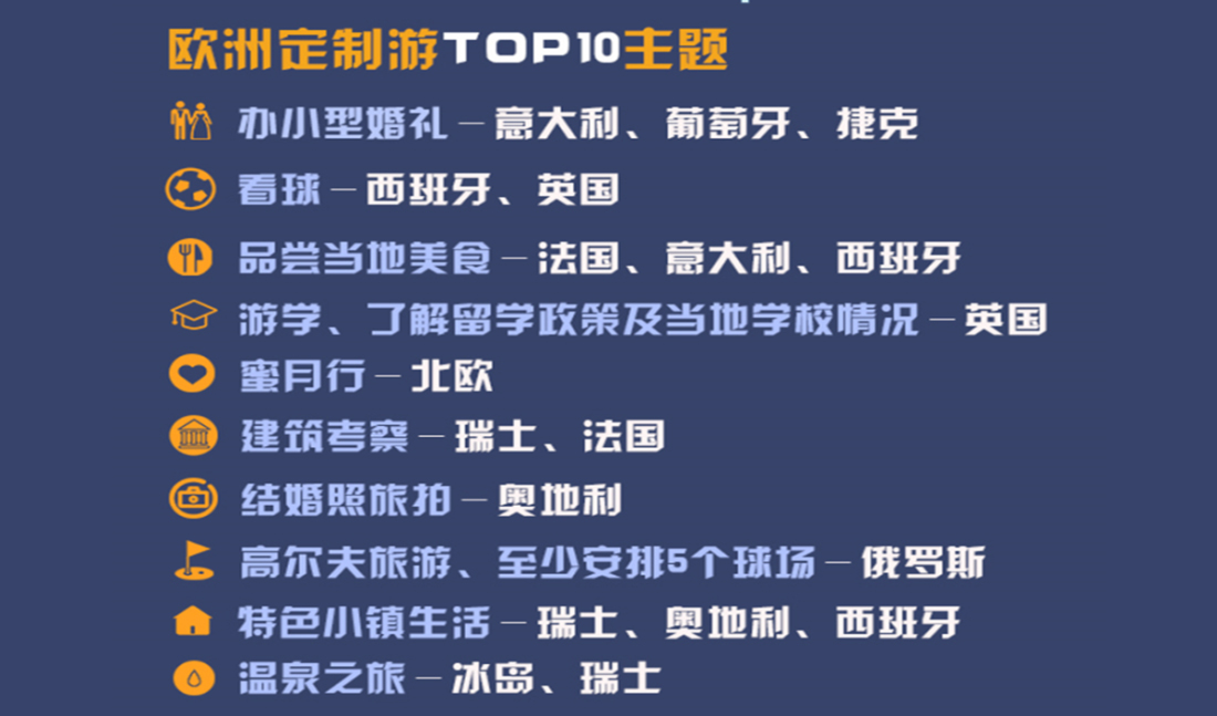 根据携程定制平台的数据统计,欧洲定制游需求单量在一季度增长了130%。欧洲定制游一次游览国家一般不超过2个,平均花费在每人每天2500元左右,办婚礼、看球、品尝美食等位列热门项目。