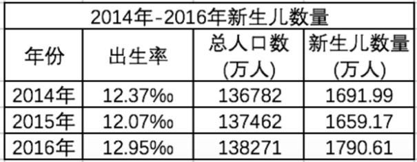 新生儿在2014-2016年间呈上升趋势,虽然在2017年有所下降,但因为中国人口基数庞大,市场规模依旧可观。