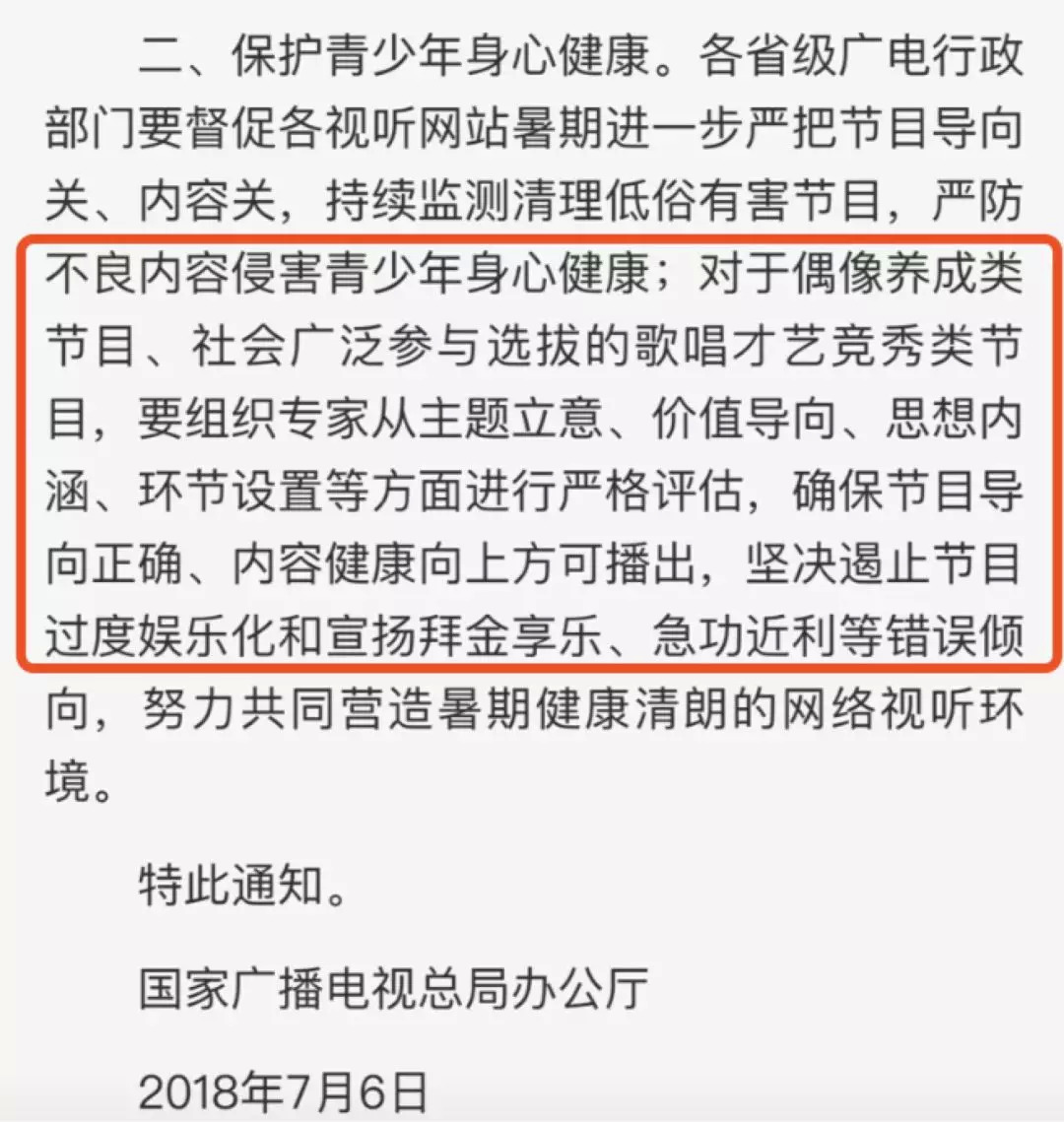 其中最引人注目的就是以下这条——“对于偶像养成类节目、社会广泛参与选拔的歌唱才艺竞秀类节目,要组织专家从主题立意、价值导向、思想内涵、环节设置等方面进行严格评估,确保节目导向正确、内容健康向上方可播出,坚决遏止节目过度娱乐化和宣扬拜金享乐、急功近利等错误倾向,努力共同营造暑期健康清朗的网络视听环境。”