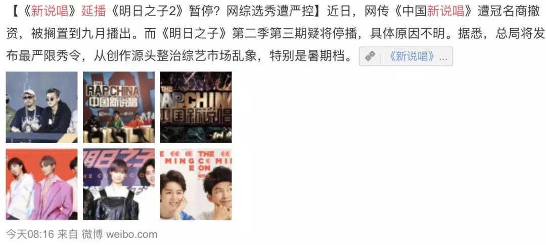 另据报道,因为这样的政策导向变化,腾讯视频推出的《明日之子》第二季第三期也将面临停播风险;而由《中国有嘻哈》更名而来的《中国新说唱》原本已经定于7月14号播出,但也因为政策监管的变化导致赞助商撤资,目前节目方已经停止一切宣传。