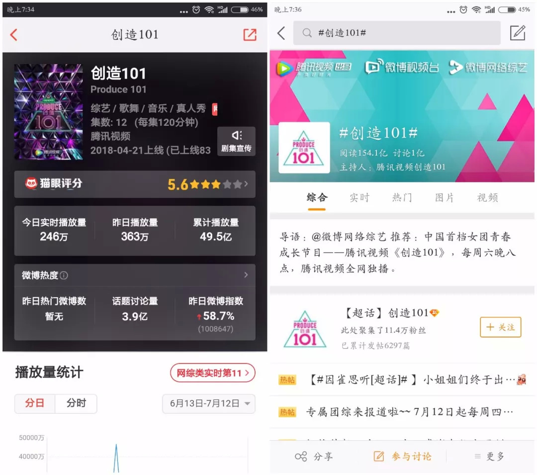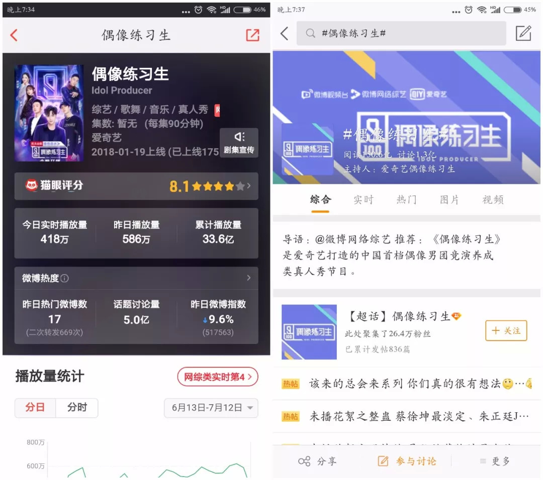 从数据上来看,恐怕更可以了解选秀综艺得风靡程度。截止7月3日,根据猫眼数据统计,《创造101》的总播放量已达49.2亿,微博话题讨论量达3.9亿,#创造101#话题阅读154.1亿;《偶像练习生》总播放量33.1亿,微博话题讨论量则超过《创造101》,达到5亿,#偶像练习生#话题阅读也有150.6亿。