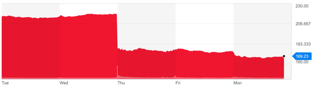 Facebook的股价遭遇重挫,市值在一天内蒸发超过1200亿美元,创下美股历史上单个交易日市值损失最高纪录。在随后的两个交易日中,Facebook、苹果、亚马逊、Netflix和谷歌合计市值损失超过1850亿美元。