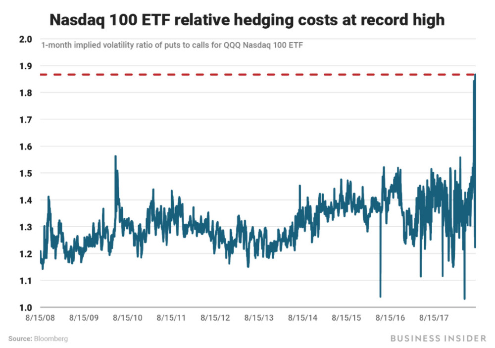目前市场中对于科技板块的恐慌已经上升到了历史最高水平,以下图表显示的是近一个月来,市场中对以科技股为主的QQQ Nasdaq ETF指数做空和做多的比例,已经上升到历史最高。