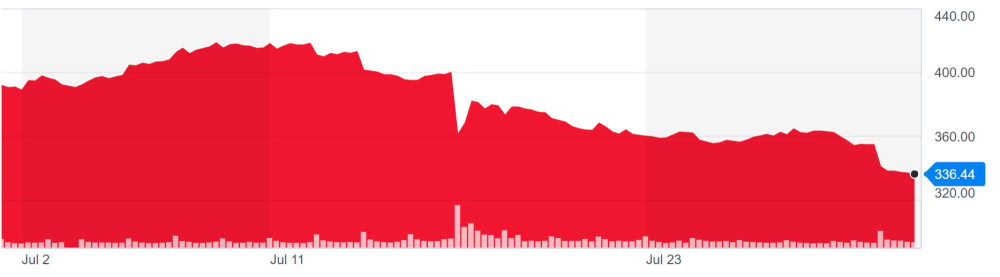 随后,Facebook一份让市场大失所望的财报发布,成为压垮市场的最后一根稻草,这家社交巨头第二季度营业收入自2015年以来首次不及预期,此外,用户增长、广告收入增长等关键指标也均低于预期,再度引起投资者恐慌性抛售,股价下挫超过20%,市值蒸发超过1200亿美元,创下了美股历史上单个交易日股价下跌造成市值损失的最大记录。