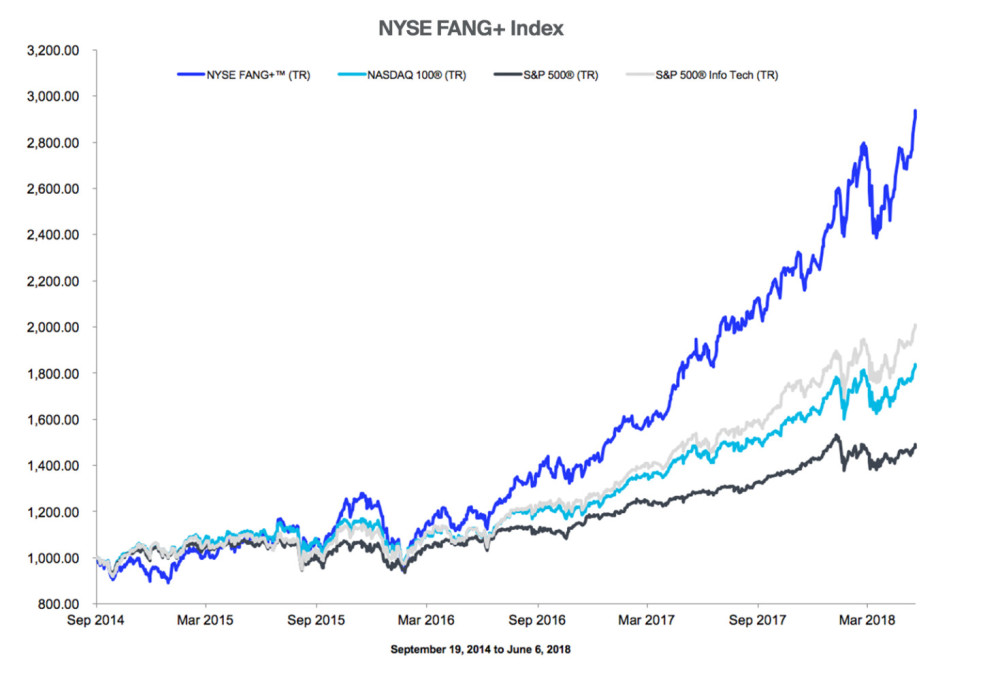 纽交所专门跟踪Facebook、亚马逊、Netflix和谷歌等科技公司的FANG+指数目前已经从6月中旬3062点的历史性高点回调了10%。该指数自2014年至今累计年化收益率为33.5%,同期标普500信息技术指数涨幅为20.6%,标普500指数涨幅为11.3%。