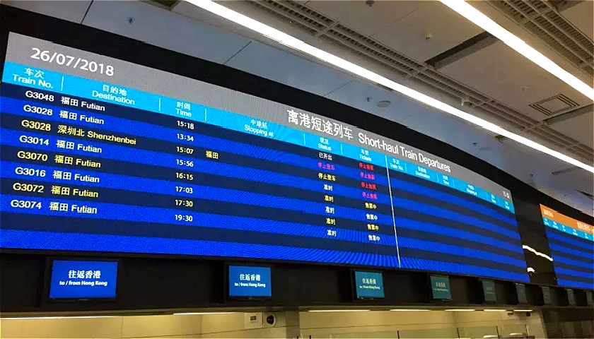 在站内G层,可以看到有几个大荧幕,分别以繁体字和简体字轮流显示列车班次和售票情况。