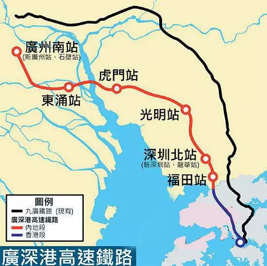 高铁列车共设7个站点:广州南站、庆盛站、虎门站、光明城站、深圳北站、福田站、西九龙站、贯穿广州、东莞、深圳、香港四个城市。