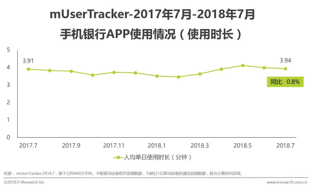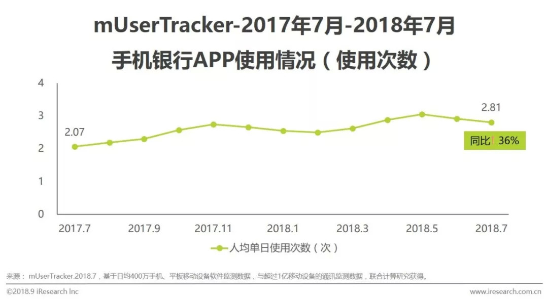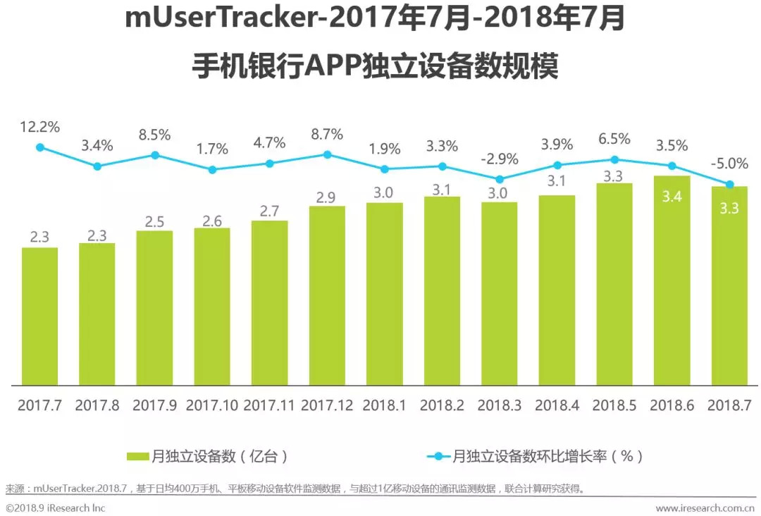 随着互联网金融的迅猛发展,手机银行也作为银行业务增长利器呈现飞跃式发展,根据艾瑞移动用户行为监测产品mUserTracker数据显示,2018年7月手机银行APP月独立设备数已超过3.2亿,同比去年7月增长44%,手机银行已成为银行业最为重要的流量入口。