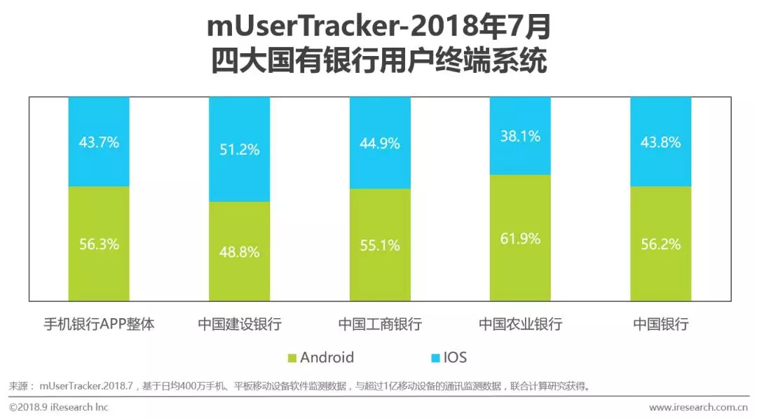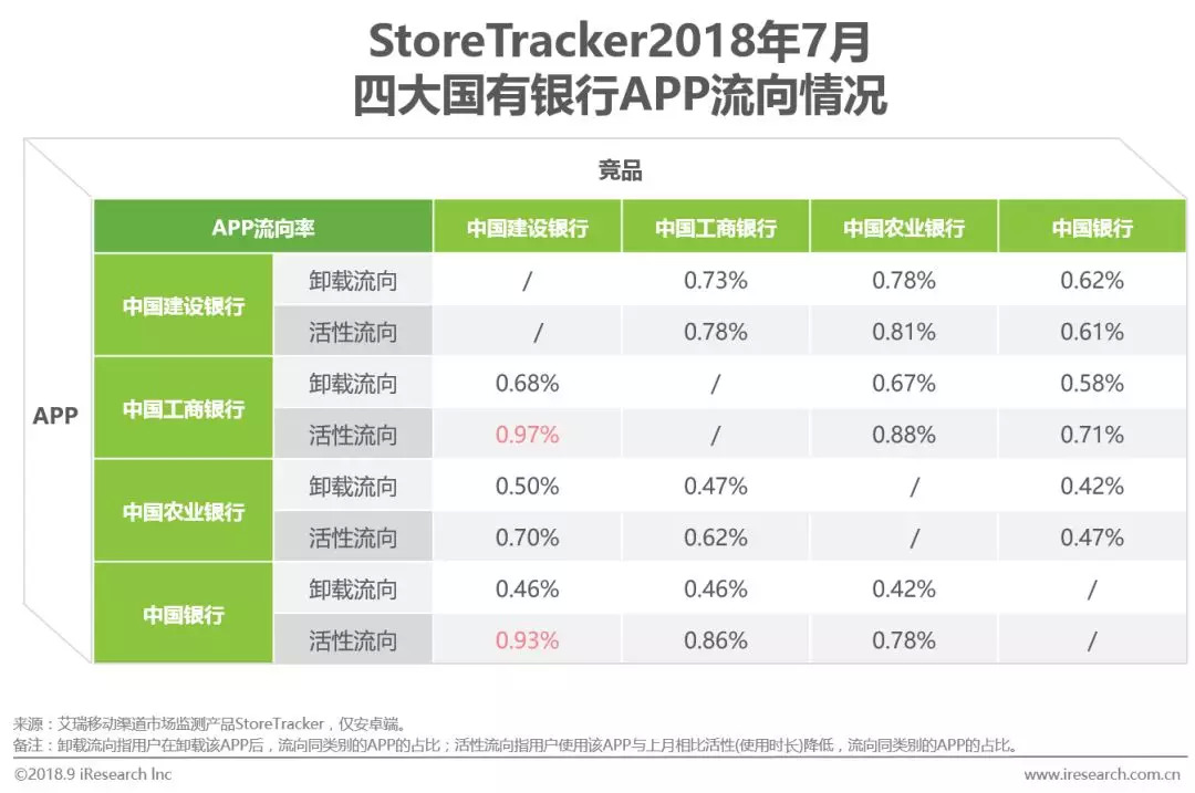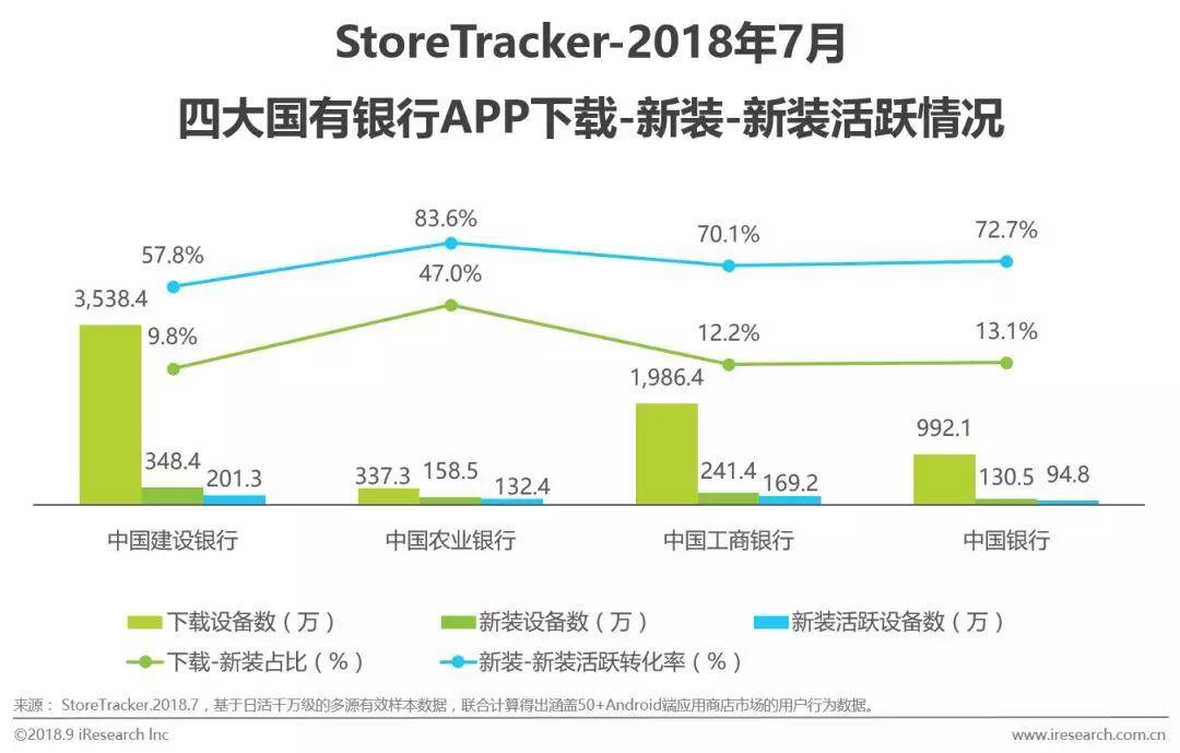 2018年7月,四大国有银行APP的下载、新装、新装活跃设备数分别占手机银行APP整体的68%、46%和43%,市场占有率强。