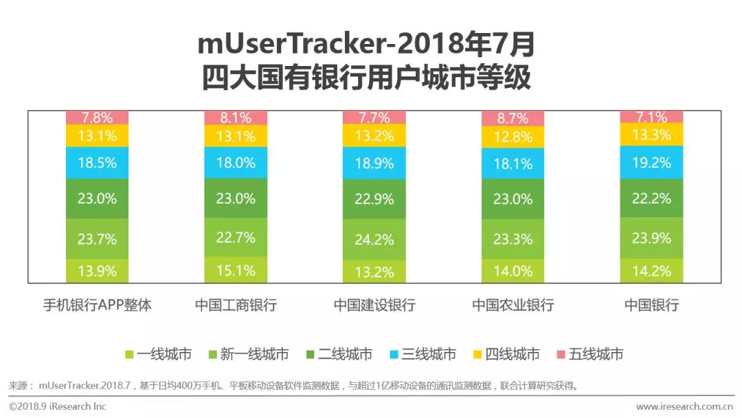 从终端系统来看,除中国建设银行外,手机银行APP的Android用户均略多于ios用户。银行与手机品牌合作时可以考虑这些因素集中投入资源避免浪费。从地域来看,用户主要集中在新一线和二线城市,为了提升用户规模,可重点了解这些地域的居民特点,开展营销活动。