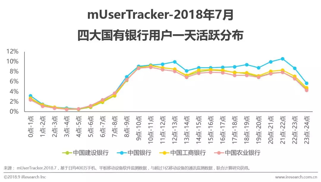 建行、工行、农行流量高峰集中在上午10点-11点的工作时间,而中行的流量高峰在午间12点-13点以及晚间21点-22点。