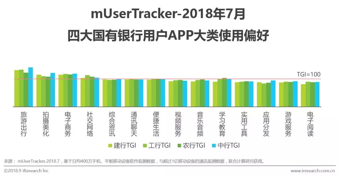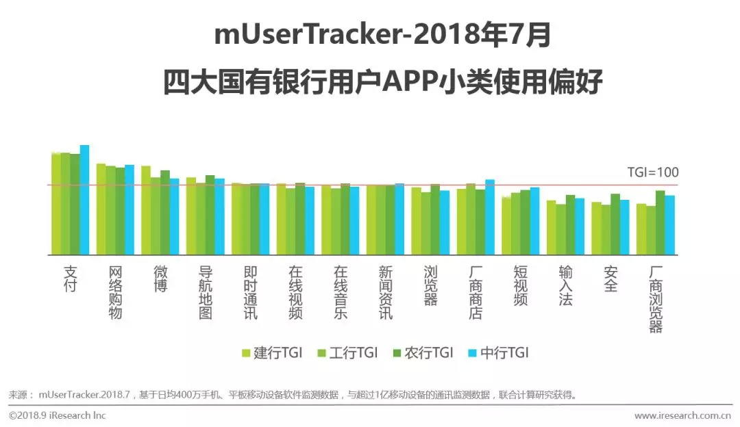 中行用户对支付需求最高,建行用户在网购类应用偏好高于其他国有银行。