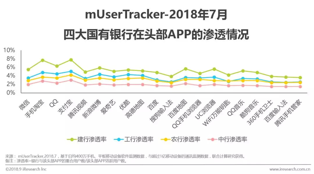 头部流量APP中,四大国有银行在支付宝的渗透率最大,其次是手机淘宝