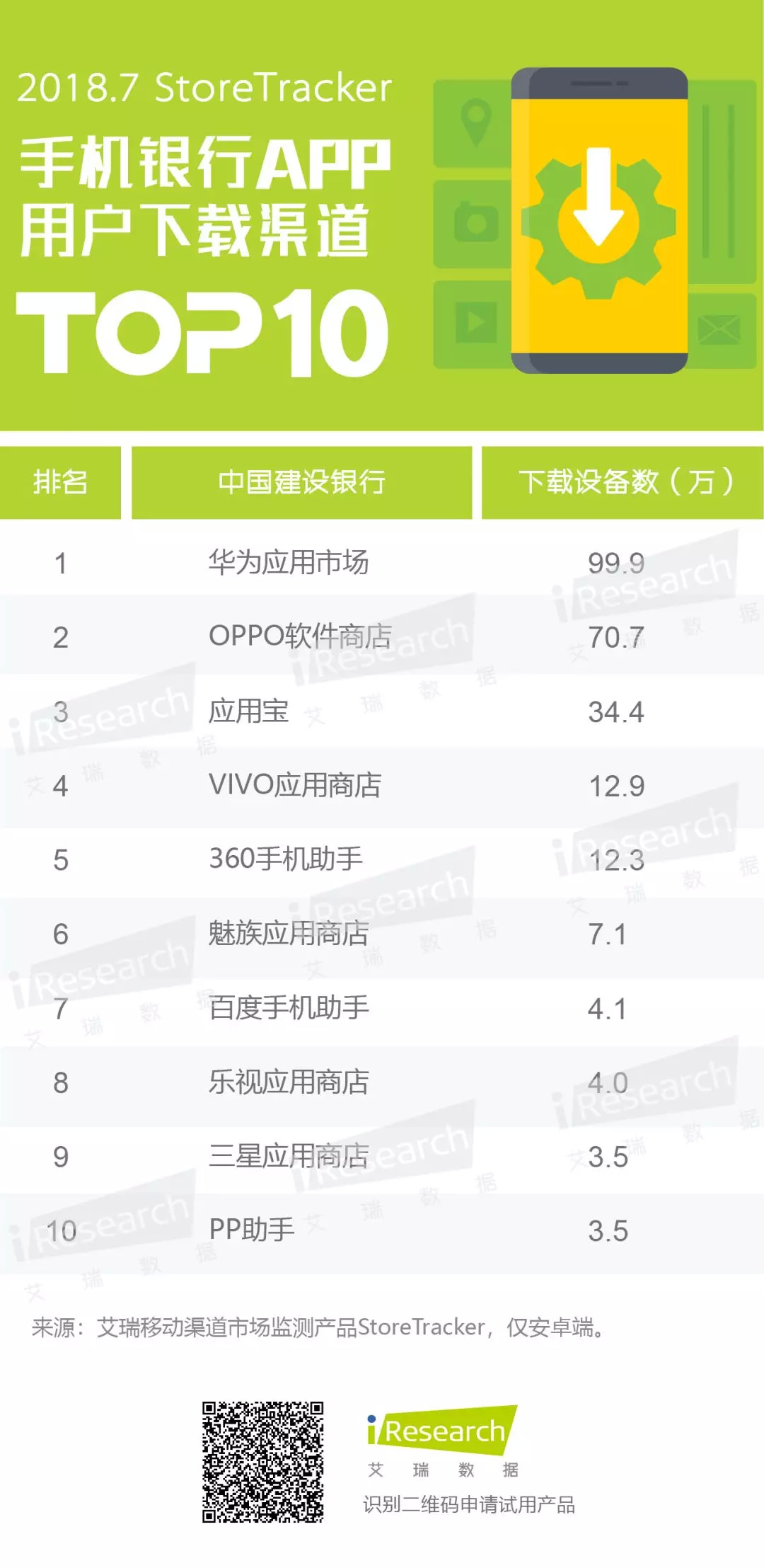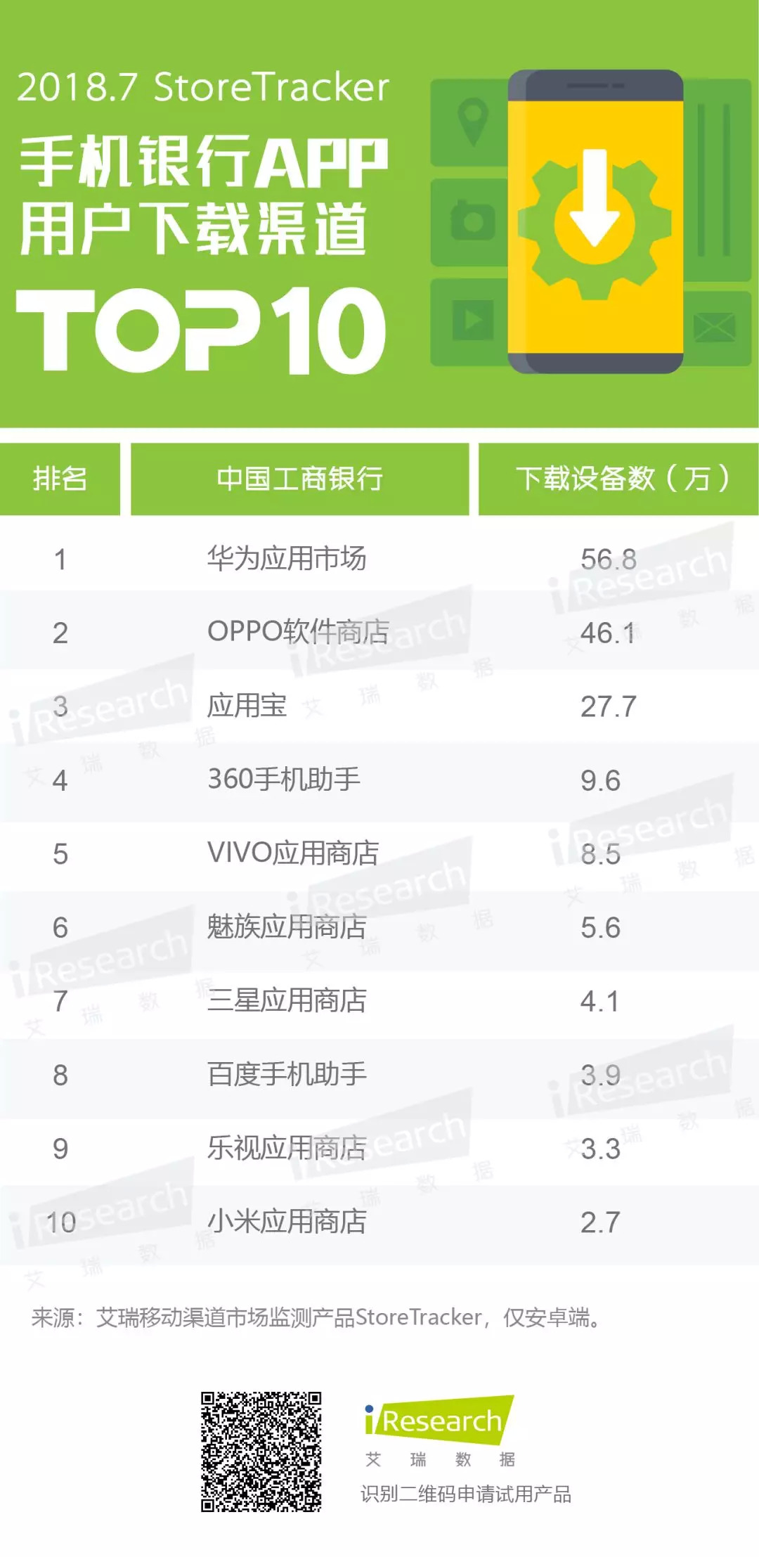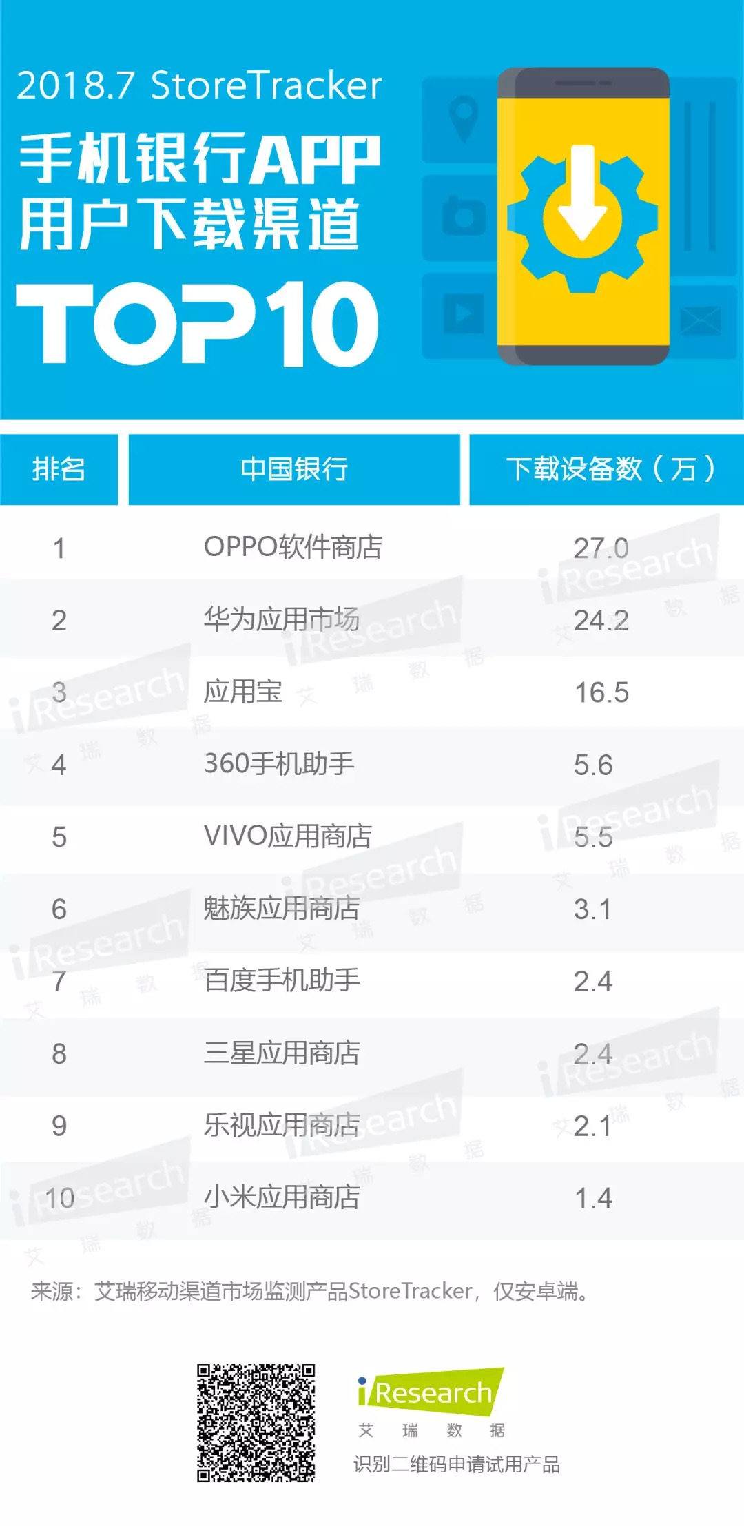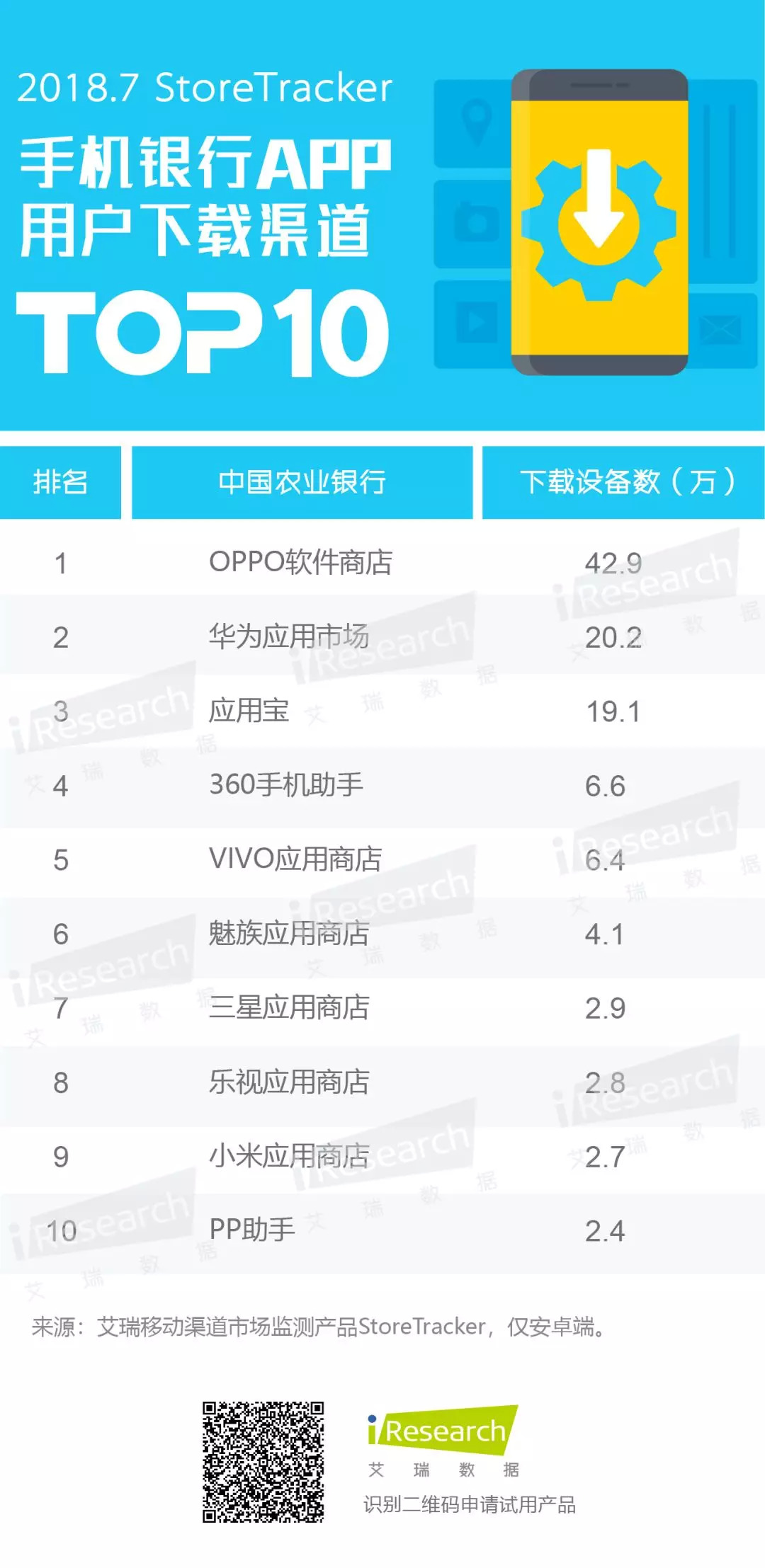 四家银行用户在安卓端下载APP渠道有明显偏好区别,2018年7月,用户下载工行、建行APP多来自华为应用市场,下载农行、中行APP多来自OPPO软件商店。此外,应用宝是四家银行APP的第三大下载渠道。