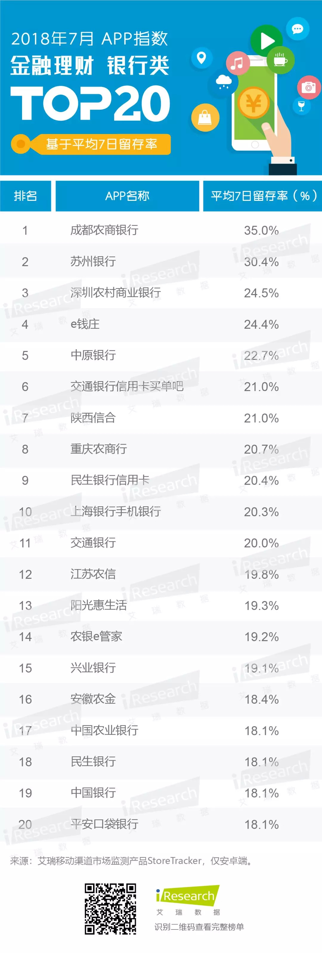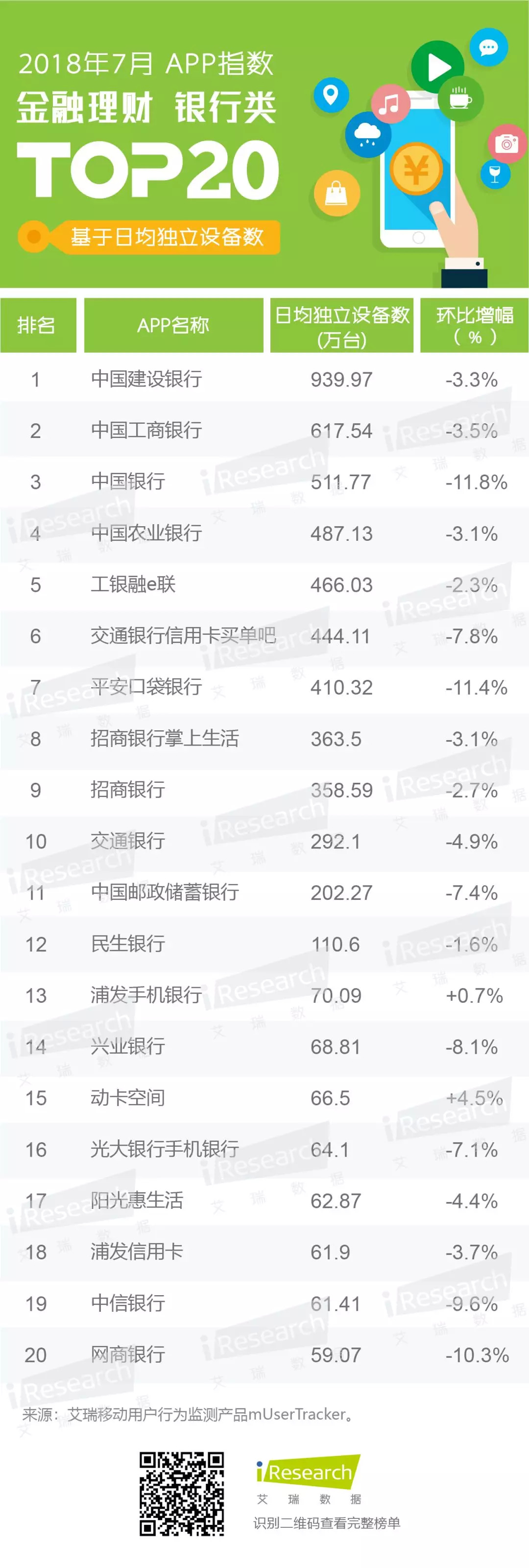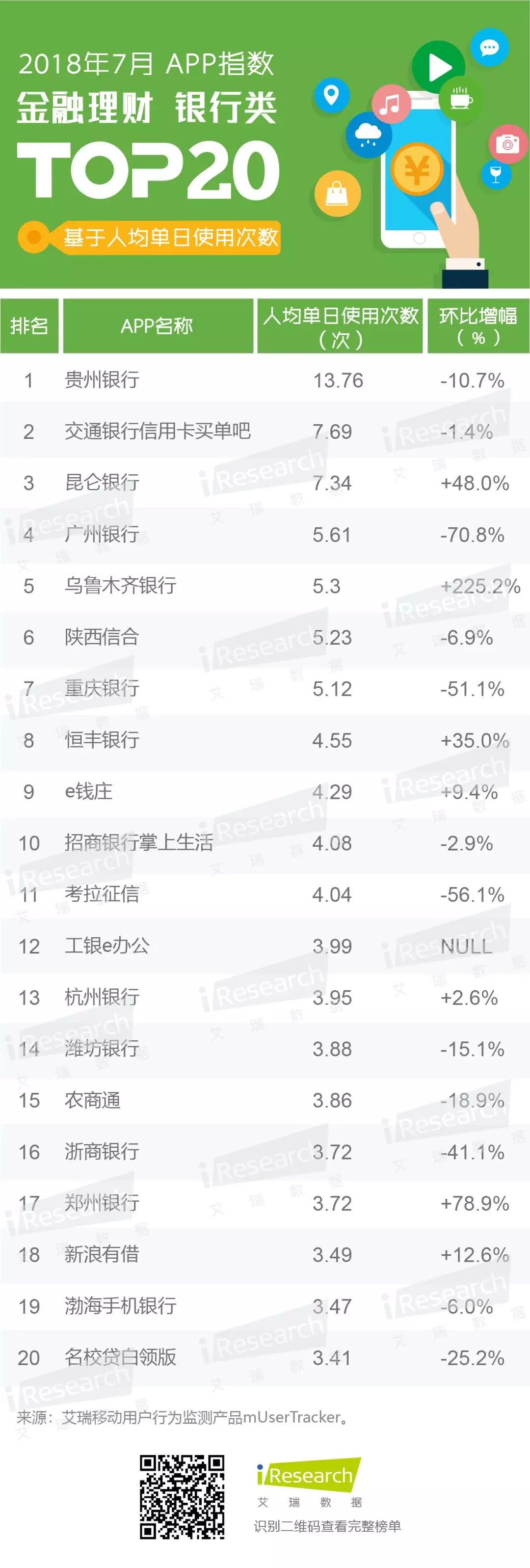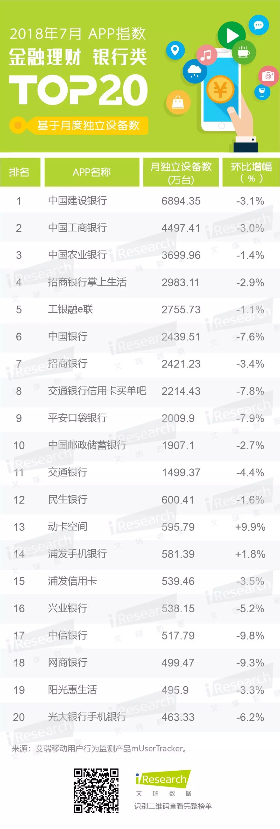 艾瑞咨询基于亿级移动样本行为数据,针对手机银行用户规模、用户特性以及运营情况进行深入分析,并基于艾瑞7月移动数据,筛选出6类TOP20手机银行APP榜单。