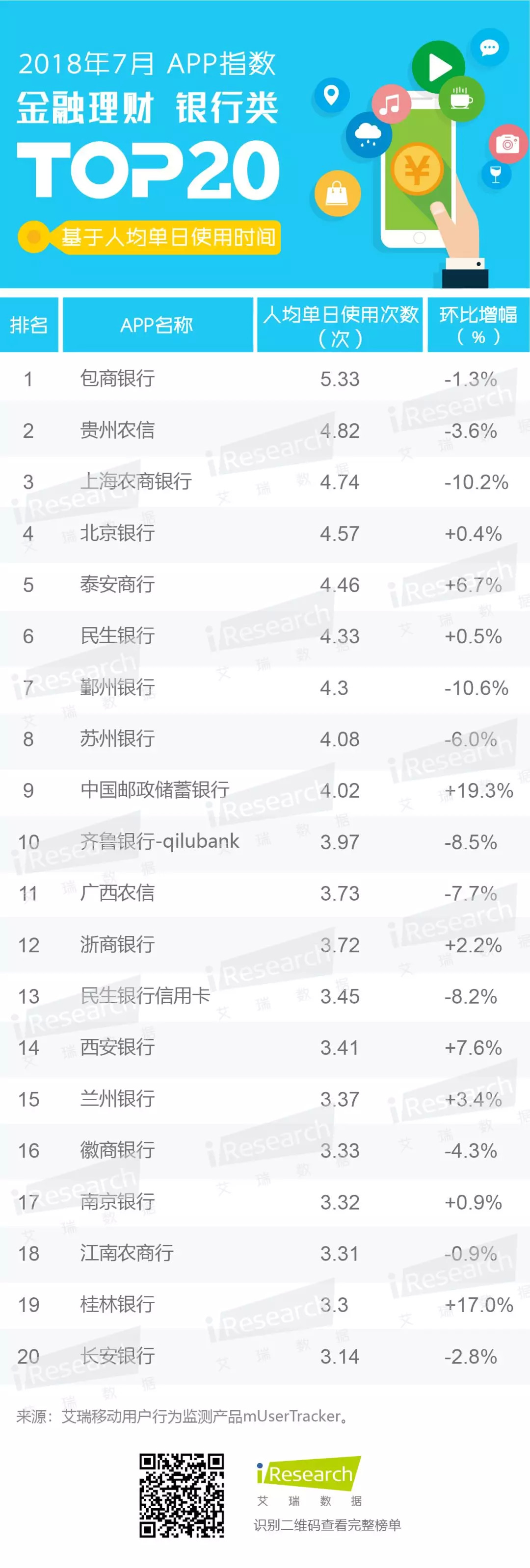 包商银行人均单日使用时间最长,超过5分钟;贵州农信居第二。
