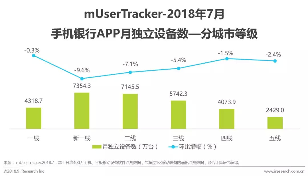 新一线和二线城市居民对手机银行APP的接受程度明显高于其他城市。但从增长率来看,今年7月全国各地手机银行APP独立设备数环比6月均有所下降,新一线城市减少幅度最大。