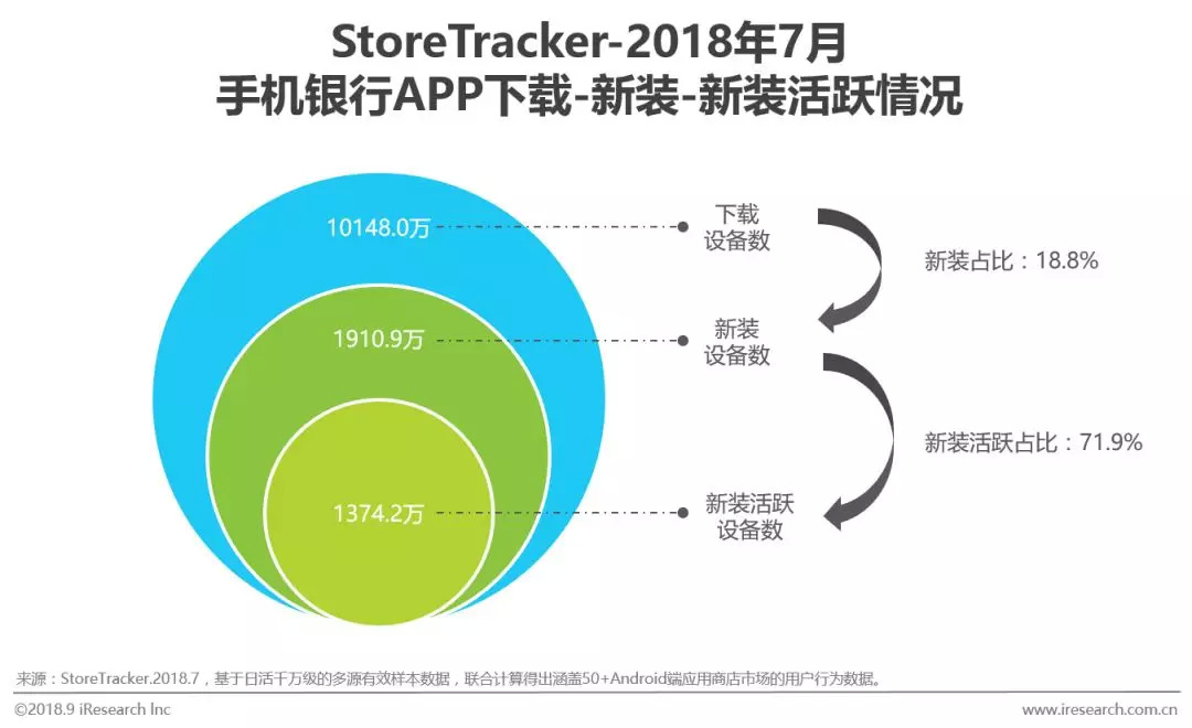 2018年7月手机银行APP下载设备数(更新+新装)超1亿,其中新装设备数达18.8%,更新率81.2%,APP更新接受度较强。新装到活跃设备转化率达71.9%,即仍有超过1/4的沉默用户存在。