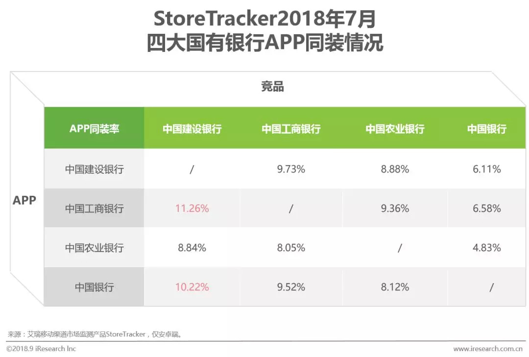 在四大国有银行中,中国建设银行是另外三大银行APP的最大竞品,中国工商银行与其同装率高达11.26%。