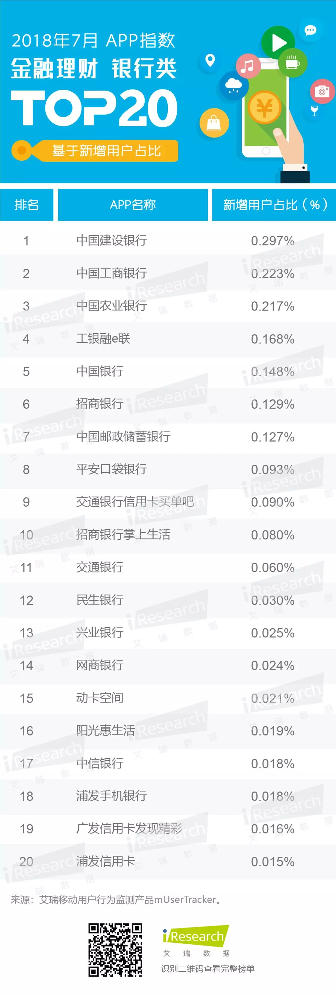 中国建设银行7月新增用户占比最大,接近3%;中国工商银行居第二。