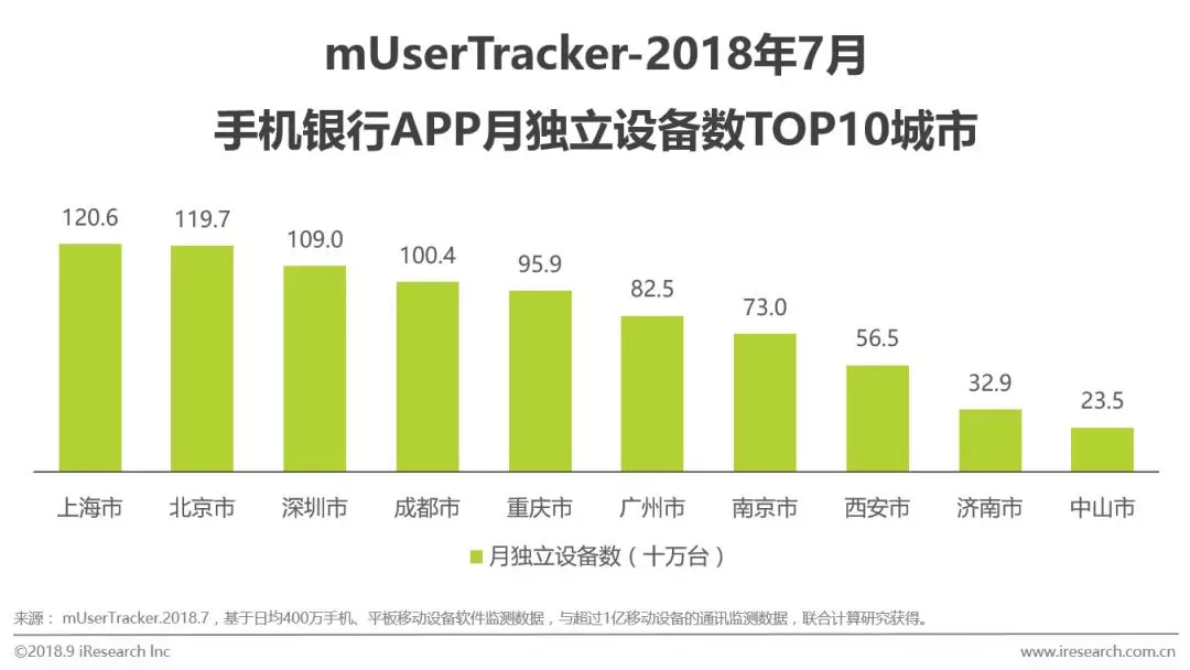 在TOP10城市中,上海、北京、深圳三城市的手机银行APP月独立设备数分列TOP3。