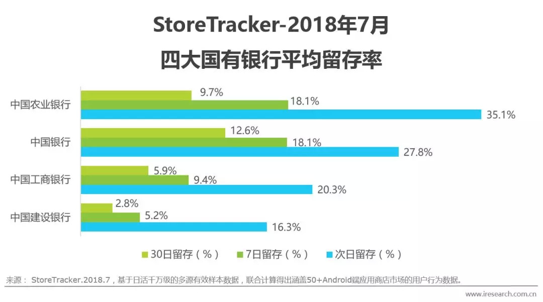 中国农业银行的次日留存和7日留存率最高,分别为35.1%和18.1%,中国银行的30日留存率最高,为12.6%。综合来看,中国银行在2018年7月的平均留存率较高,且相对稳定,在次日留存的用户中有将近一半(45.3%)30日后仍然留存,用户忠诚度高。