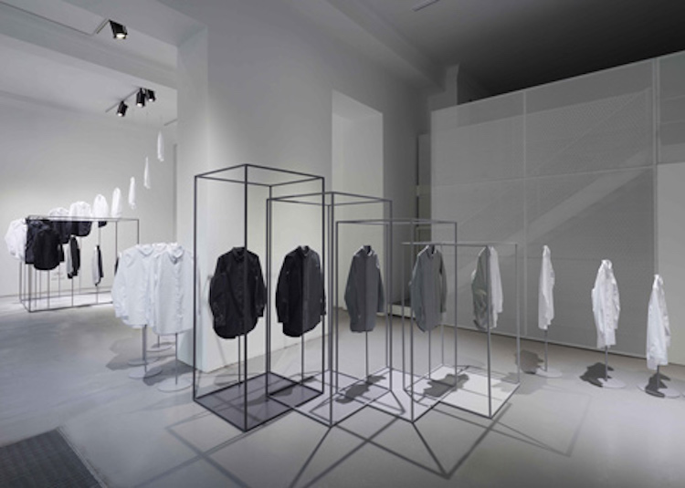 COS 的招牌白衬衫,以不同部位的染色被连贯陈列,在纯白的空间和黑色纤细的钢架之间,划出了一条流畅而简约的墨色线条。