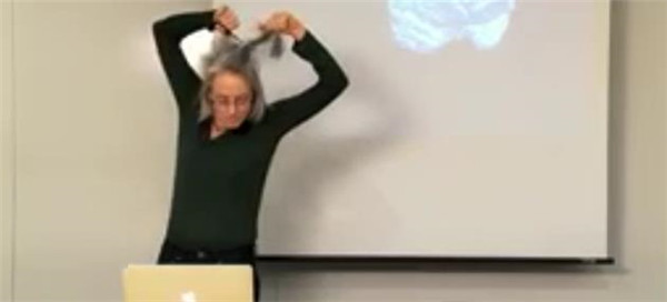 随着讲解,她发现自己的头发好累赘,没有办法指着自己的脑袋告诉同学们大脑认知功能区域具体在哪个位置,于是她抄起一把剪刀,咔擦减掉一大截头发: