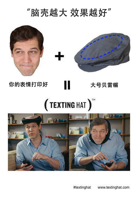 “短信帽”(Texting Hat)来了。戴上它,既能让你和身边人保持亲切友好的眼神接触,又能让你与手机屏幕整天恩爱缠绵无拘无束。