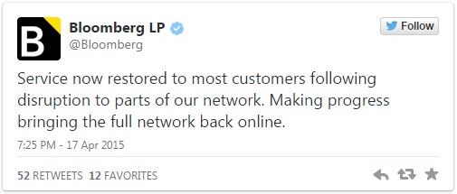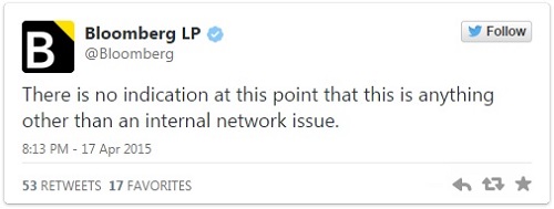 对于此次故障,彭博否认了黑客攻击的可能性,在其官方twitter账号上称故障是因内部网络问题而起。↓