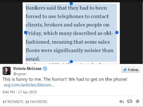 《华尔街日报》记者Victoria McGrane觉得挺欢乐:好恐怖,交易员只能打电话了。↓
