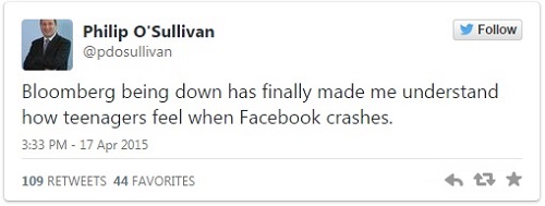 经济学家Philip O'Sullivan表示,“彭博宕机终于让我明白,当Facebook崩溃的时候青少年们的心情。”↓