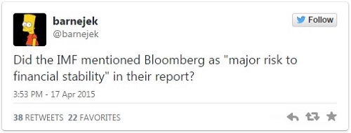 用户@barnejek 在向国际货币基金组织提醒,亲,下回发报告,别忘了加上一条:“彭博终端会给金融市场稳定带来风险”。↓