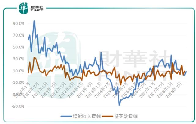 澳门基础设施的完善必然带动访澳游客的增长,然而游客增长就必然能带旺娱乐场的生意吗?未必。我们来看看以下博彩收入增幅与游客增幅比较图。