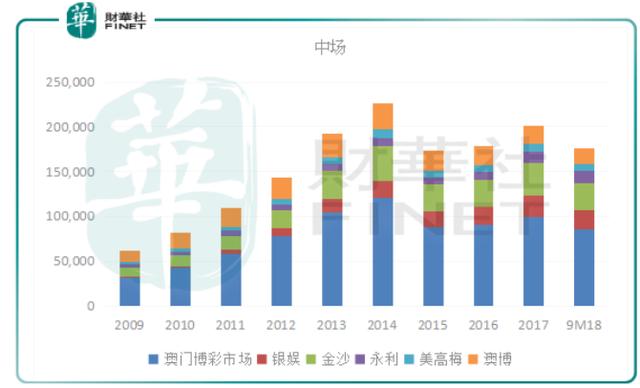 想必精明的读者已经留意到,金沙的投注额与银娱和永利根本不是一个重量级,为何收入和利润却高于后两者。从投注额分类中,我们可以看到,金沙的总额虽然不是五者最高,但中场博彩投注额却鹤立鸡群,占比达到20%,相较银娱只有5%,永利则为7%。我们已在前文解释过中场博彩业务的利润率为何较高,在此不再重复。