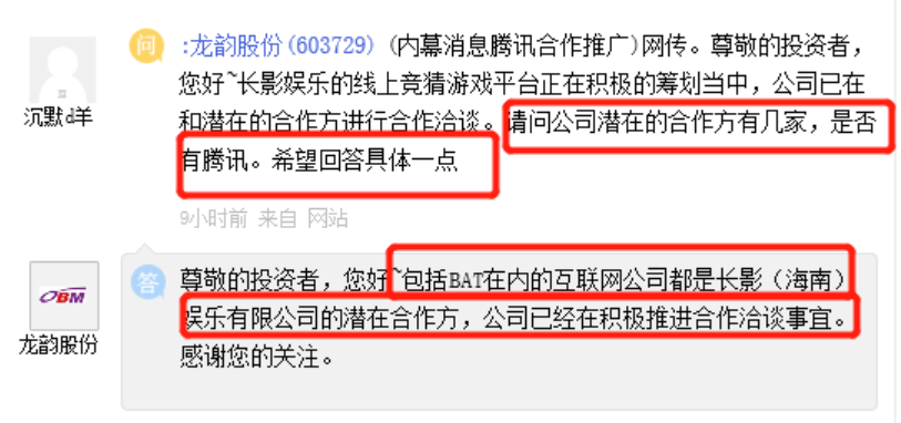 今年年初,互联网“独角兽”之风正盛,有投资者在上证e互动上对龙韵股份(603729)提问,表示希望知道公司潜在的合作方中是否有腾讯。随后龙韵股份回复称,“包括BAT在内的互联网公司都是公司旗下长影娱乐有限公司的潜在合作方。”一个“潜在合作方”可谓留足了想象空间,把明明没有的事说出了可能性。