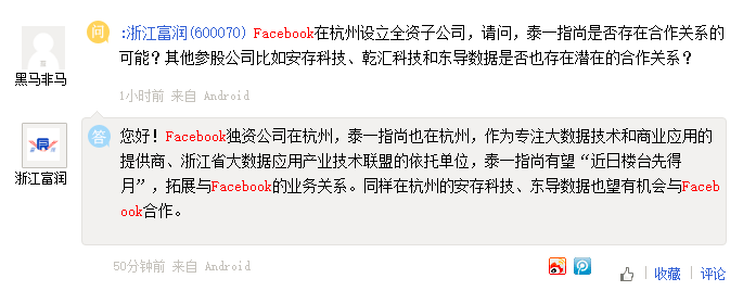 除此之外,在今年曾经昙花一现的Facebook概念也让董秘抓住了“吹牛”的机会:浙江富润(600070)的套路与龙韵股份如出一辙,把明明不存在的业务往来说成了“有望近日楼台先得月,拓展与Facebook的业务关系。”足见董秘回答功力之深厚。