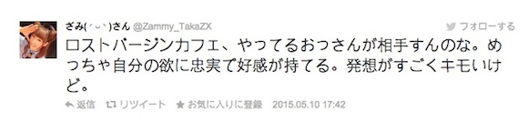 “lostvirgincafe,实际上就是个大叔想啪啪啪吧。忠于自己的欲望这一点要点个赞。不过想法是龌龊了点。”