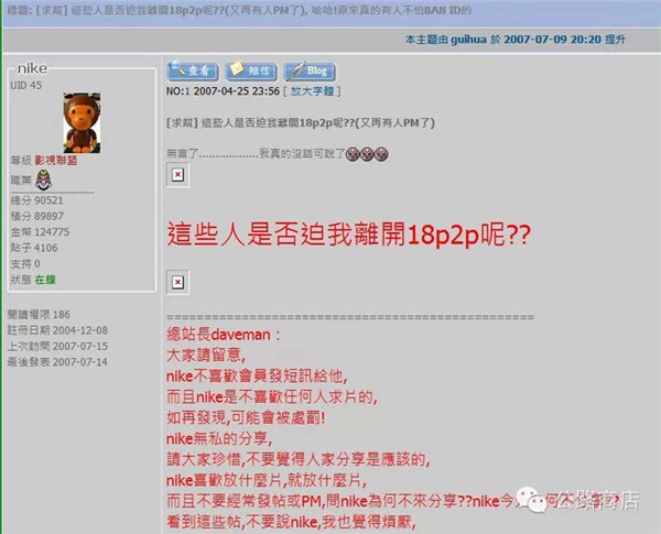 NIKE本人也是神龙见首不见尾,在论坛里不聊天不吹水,发种就撤,绝不久留。他很讨厌别人PM求片,只放自己喜欢的作品。甚至管理员都明令禁止其他人打扰NIKE,违者封号。NIKE能保证的就是:“一时三刻并不代表我没有上传,nike的保証就是24小时内一定可完档,同时亦希望大家SEED24小时~~”