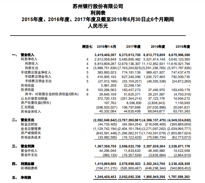 根据苏州银行2018年半年度公开报告显示,2015年-2017年营业收入分别为66.76亿元、66.14亿元、63.74亿元。2015年-2017年净利润分别为23.38亿元、23.52亿元、25.79亿元。