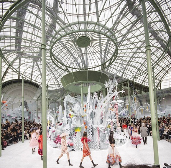 1月27日,巴黎大皇宫的玻璃穹顶下,Chanel为自己2015春夏高定架设了一座玻璃花房。