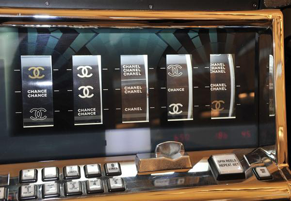 不仅每一张牌桌都配有穿着精致的庄家,秀场内还设有老虎机,上面装点有 Chanel的“双C”LOGO。