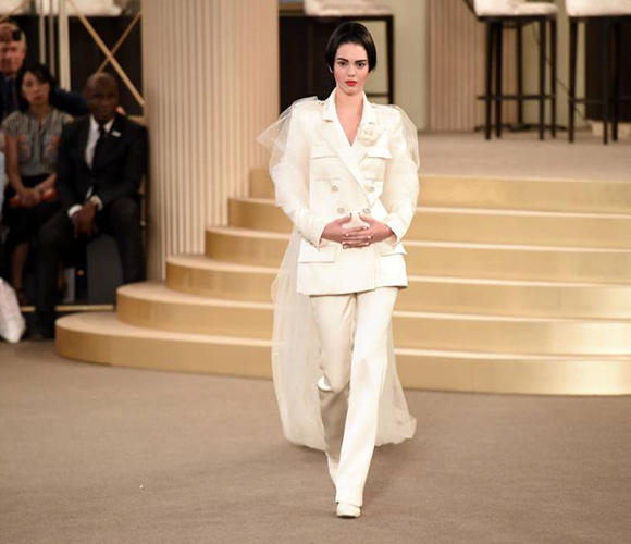 闭幕嘉宾是穿白西装肩披白纱的Kendall Jenner。