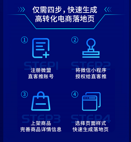 在直营电商2.0时代,商家将构建以小程序为载体的交易闭环,最终打通“流量——拓客——裂变——复购”的全链路营销。在腾盟计划为直营电商打造的小程序购物闭环中,最重要的环节就是电商SaaS工具——微盟“直客推”解决方案,它将以“广告+小程序”双引擎为核心,将精准营销与SaaS软件协同,集合广告投放、商品管理、客户管理、订单管理等功能,帮助商家全渠道多触点获取私域流量,解决商家在购买转化、数据追踪、用户复购等方面的痛点问题。