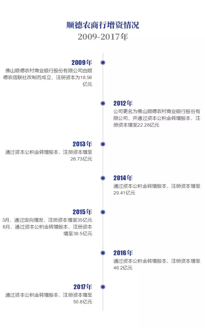 而2009年改制成立时,公司的名称为“佛山顺德农村商业银行股份有限公司”。2012年,公司将名称变更为“广东顺德农村商业银行股份有限公司”。随后,在经历7次增资,包括一次定向增发后,公司的注册资本达到50.8亿元。以下为公司发展历程及增资情况: