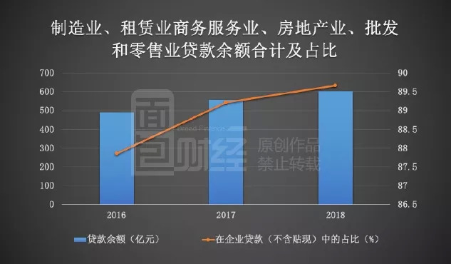 从企业贷款的结构来看,其主要集中于制造业、租赁和商务服务业、房地产业和批发和零售业。截止2018年底,以上打个行业的贷款余额合计达604.53亿元,占企业贷款总额的89.66%,切成逐年上升的趋势。