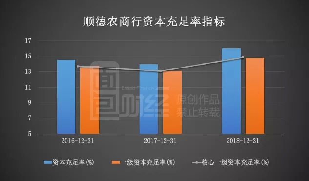 此外,顺德农商行的三项资本充足率指标也有明显提升。截止2018年末,公司的资本充足率为15.96%,较上年同期上升2.01个百分点,一级资本充足率和核心一级资本充足率均为14.83%,较上年同期上升1.77个百分点。